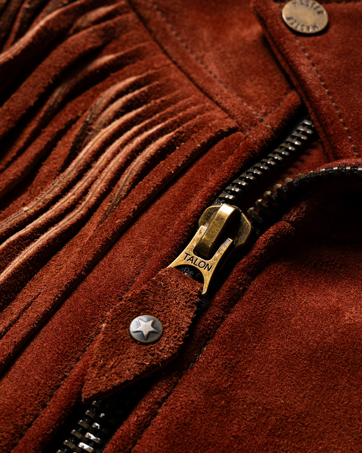Key design changes refine the Ranger’s balance of utility and style: shoulder epaulets are removed for a cleaner profile, while a Western coin pocket and scalloped back yoke carry fringe detailing for movement and texture. The body is lined in 100% cotton twill in red, offering a bold contrast to the exterior.