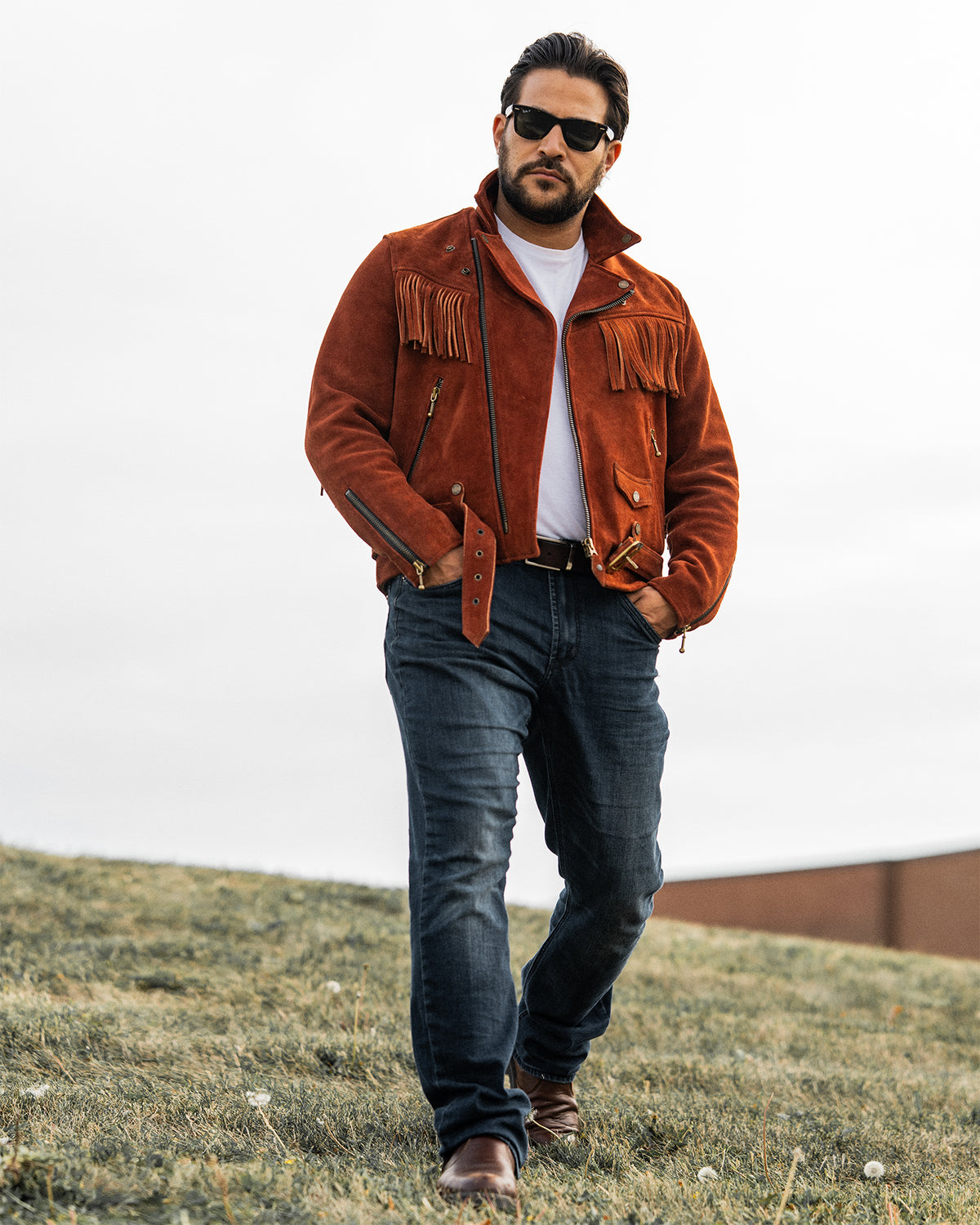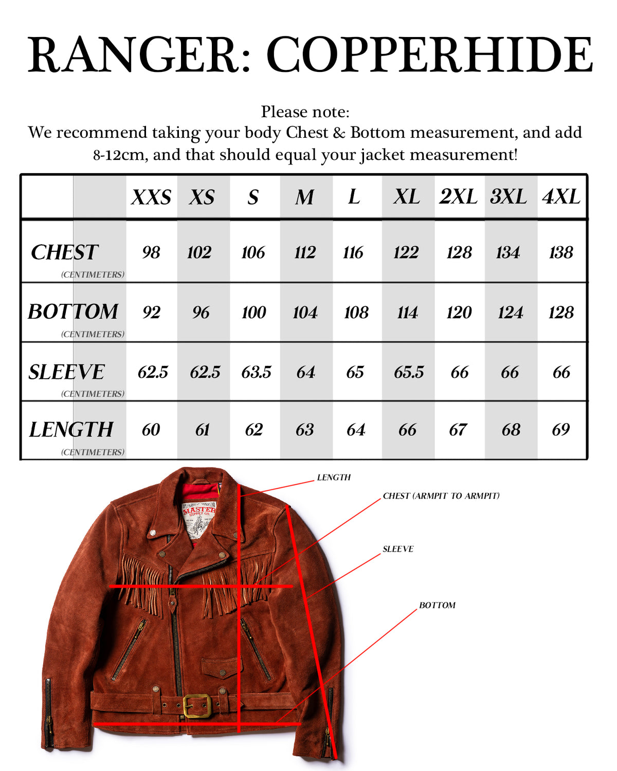 The Ranger leather jacket takes the classic American biker silhouette and reworks it in full-grain roughout cowhide, finished in Copperhide. The burnished copper tone, sitting between rust and sun-baked clay, brings a new depth to this Western-influenced style, while the natural nap captures light and patinas with wear.
