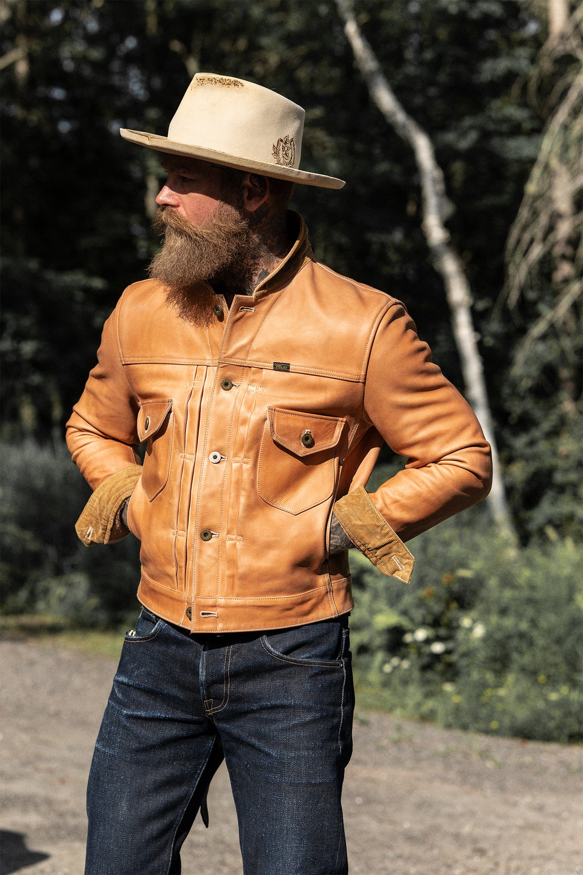 The Sunborn is our interpretation of the classic Type II trucker, built from natural vegetable-tanned cowhide and finished with subtle workwear details throughout.