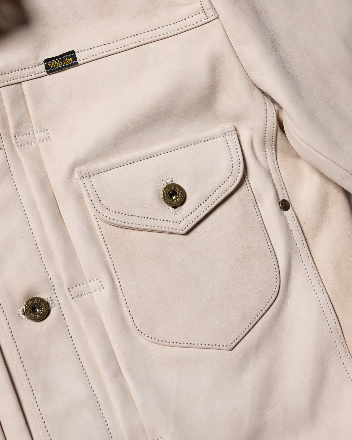 This jacket is made from full-grain, undyed vegetable-tanned cowhide. Due to the unfinished nature of the leather, tonal variation, visible grain, and small surface marks are to be expected. These are inherent to the material and are not considered defects.