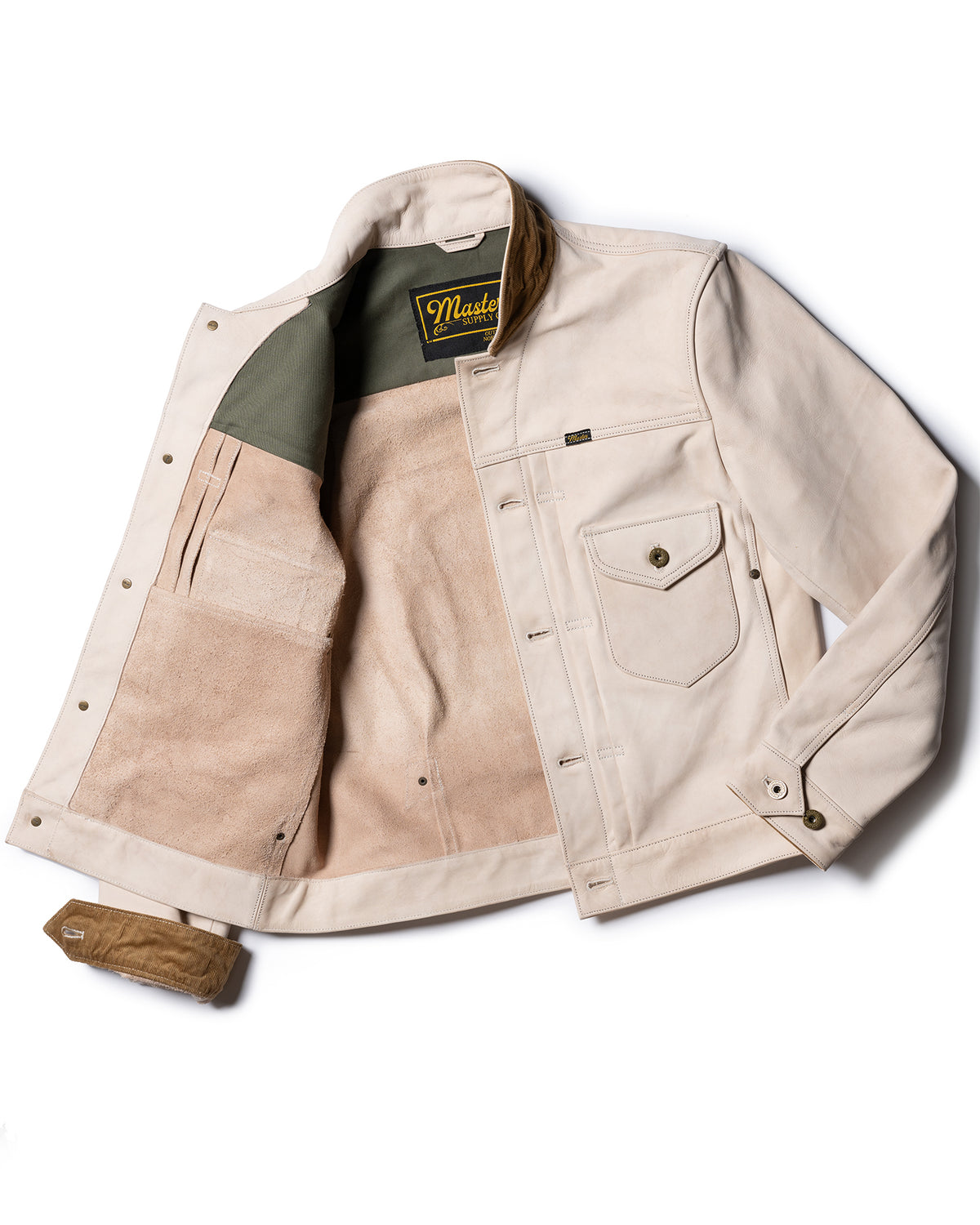 Subtle workwear details carry through the upper construction. A sage green cotton insert lines the inside of the collar for comfort against the neck, while corduroy reinforcement beneath the collar and inside the cuffs adds durability in high-wear areas.
